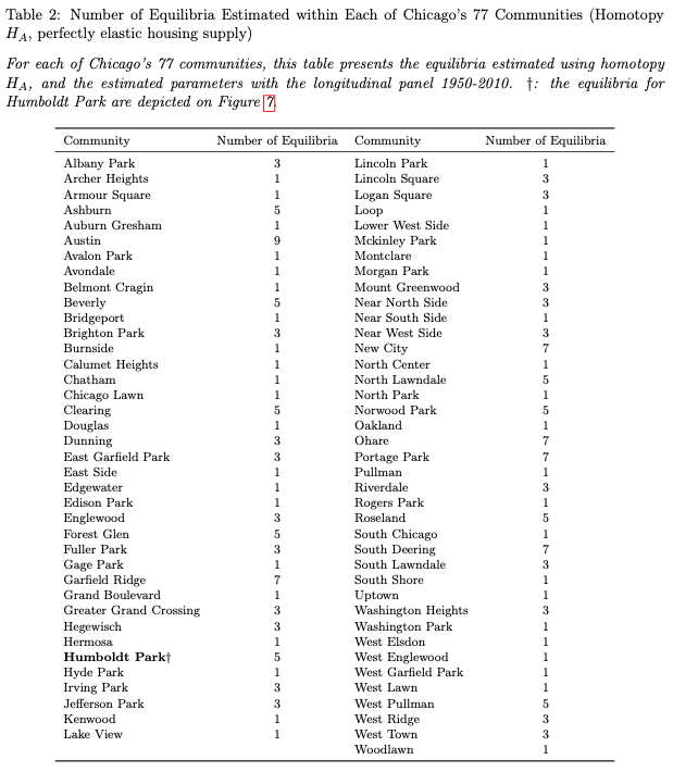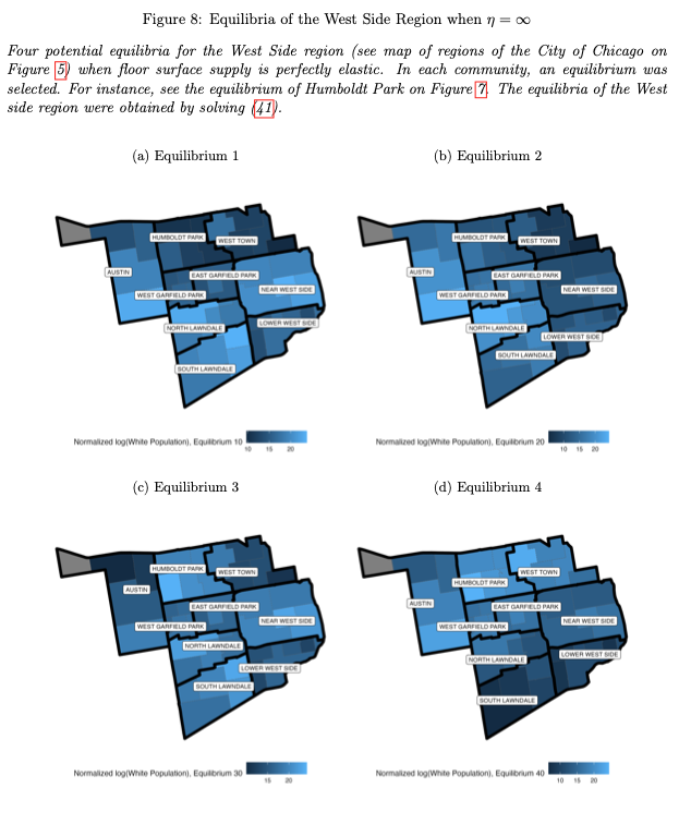New! Equilibrium Multiplicity in Quantitative Spatial Models, with an Application to Chicago Link to the paper. Discrete choice models with social interactions or spillovers may exhibit multiple equilibria. This paper provides a systematic approach to enumerating them for a quantitative spatial model with discrete locations, social interactions, and elastic housing supply. The approach relies on two homotopies. A homotopy is a smooth function that transforms the solutions of a simpler city where solutions are known, to a city with heterogeneous locations and finite supply elasticity. The first homotopy is that, in the set of cities with perfectly elastic floor surface supply, an economy with heterogeneous locations is homotopic to an economy with homogeneous locations, whose solutions can be comprehensively enumerated. Such an economy is epsilon close to an economy whose equilibria are the zeros of a system of polynomials. This is a well-studied area of mathematics where the enumeration of equilibria can be guaranteed. The second homotopy is that a city with perfectly elastic housing supply is homotopic to a city with an arbitrary supply elasticity. In a small number of cases, the path may bifurcate and a single path yields two or more equilibria. By running the method on thousands of cities, we obtain a large number of equilibria. Each equilibrium has different population distributions. We provide a method that is computationally feasible for economies with a large number of locations choices, with an empirical application to the City of Chicago. There exist multiple “counterfactual Chicagos” consistent with the estimated parameters. Population distribution, prices, and welfare are not uniquely pinned down by amenities. The paper’s method can be applied to models in trade and IO. Further applications of algebraic geometry are suggested.